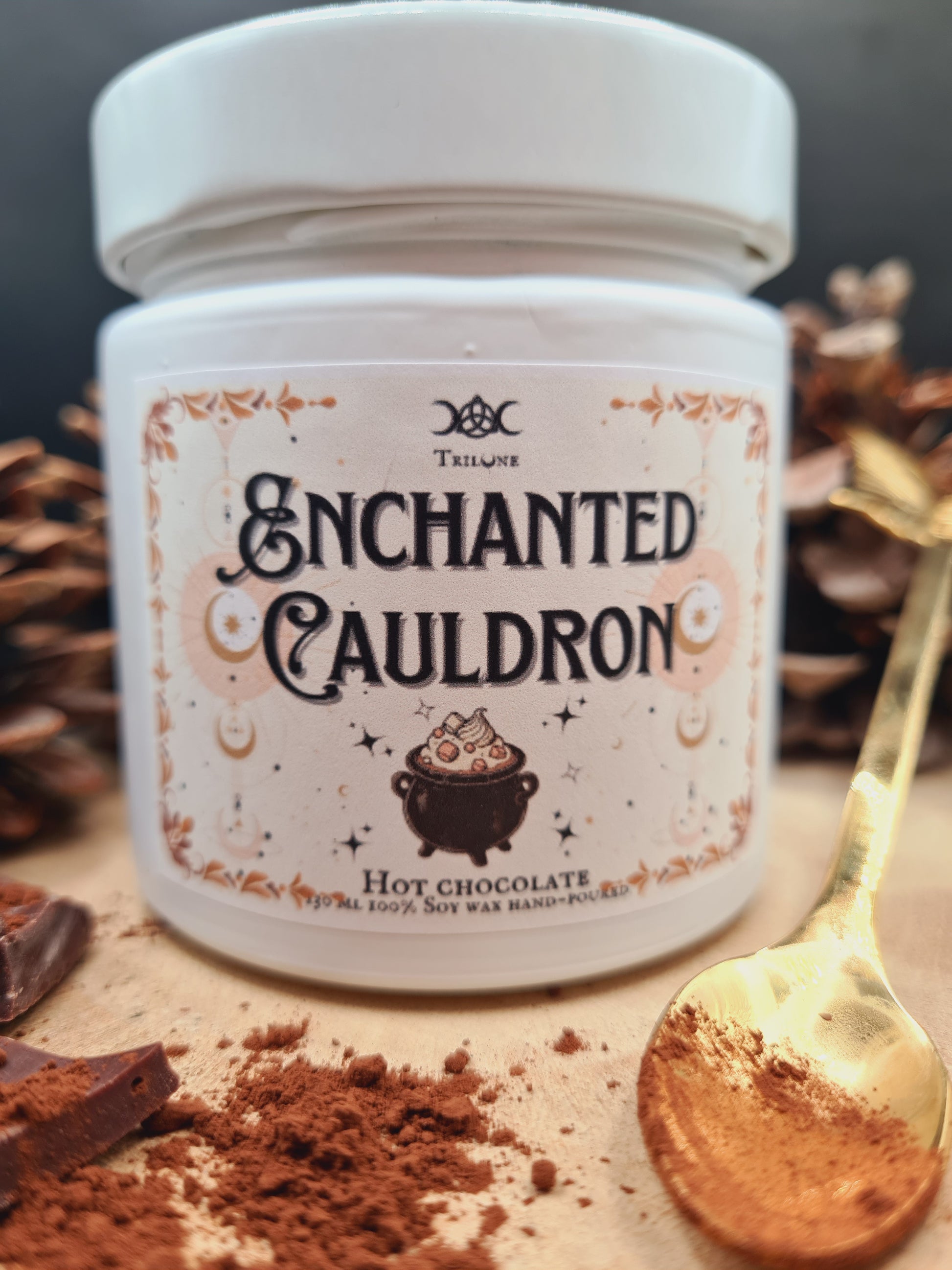 Lasciati avvolgere dalla magia del profumo della cioccolata calda con la Candela "Enchanted Cauldron". Realizzata in cera di soia naturale, questa candela diffonde un aroma goloso e avvolgente che trasforma qualsiasi ambiente in un rifugio caldo e accogliente, perfetto per l’inverno o per rilassarsi durante serate tranquille.